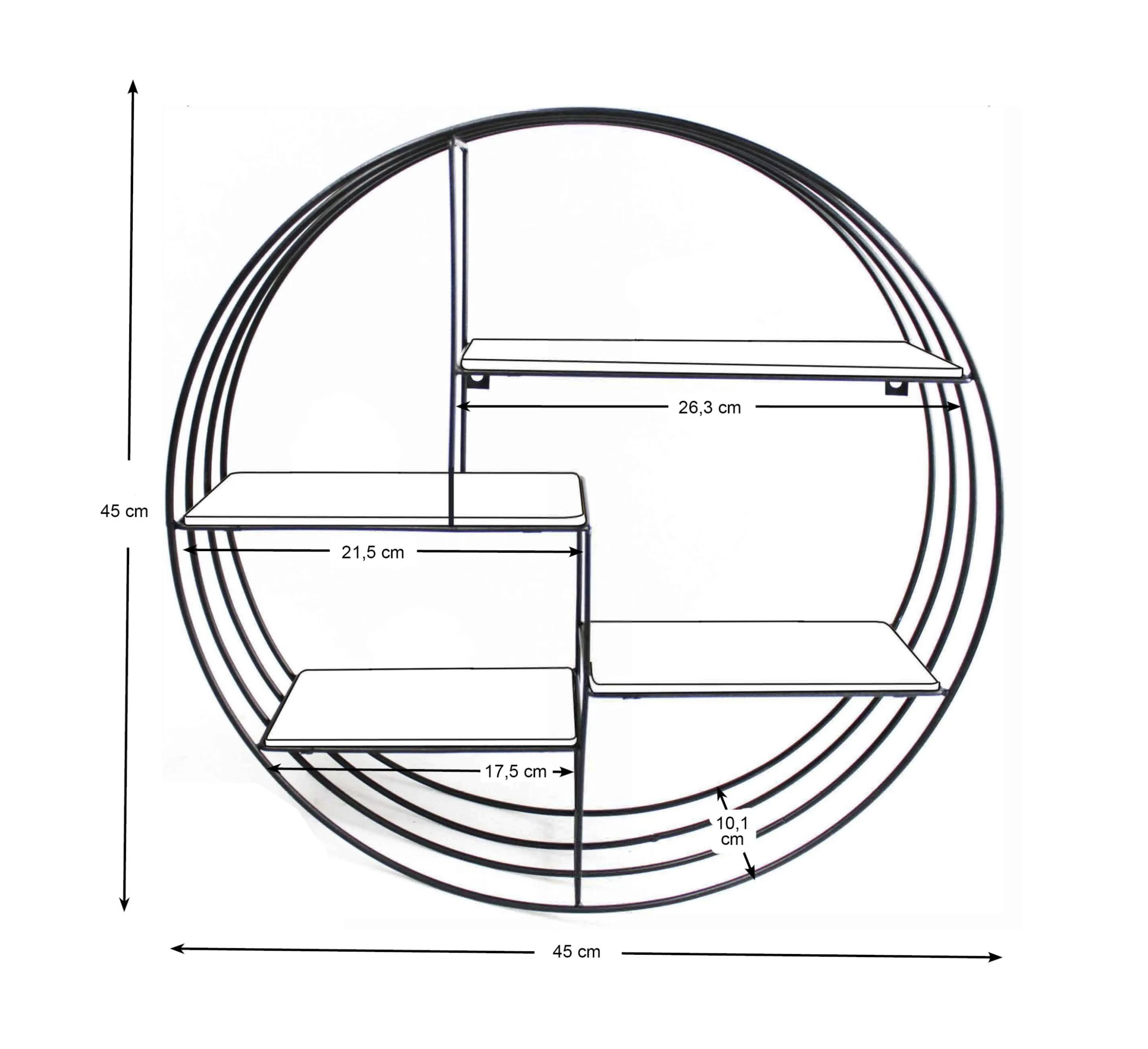Wandrek Bas met diameter 45cm, gemaakt uit een gepoedercoated zwart metalen frame en 4 legplanken in Paulownia-hout.