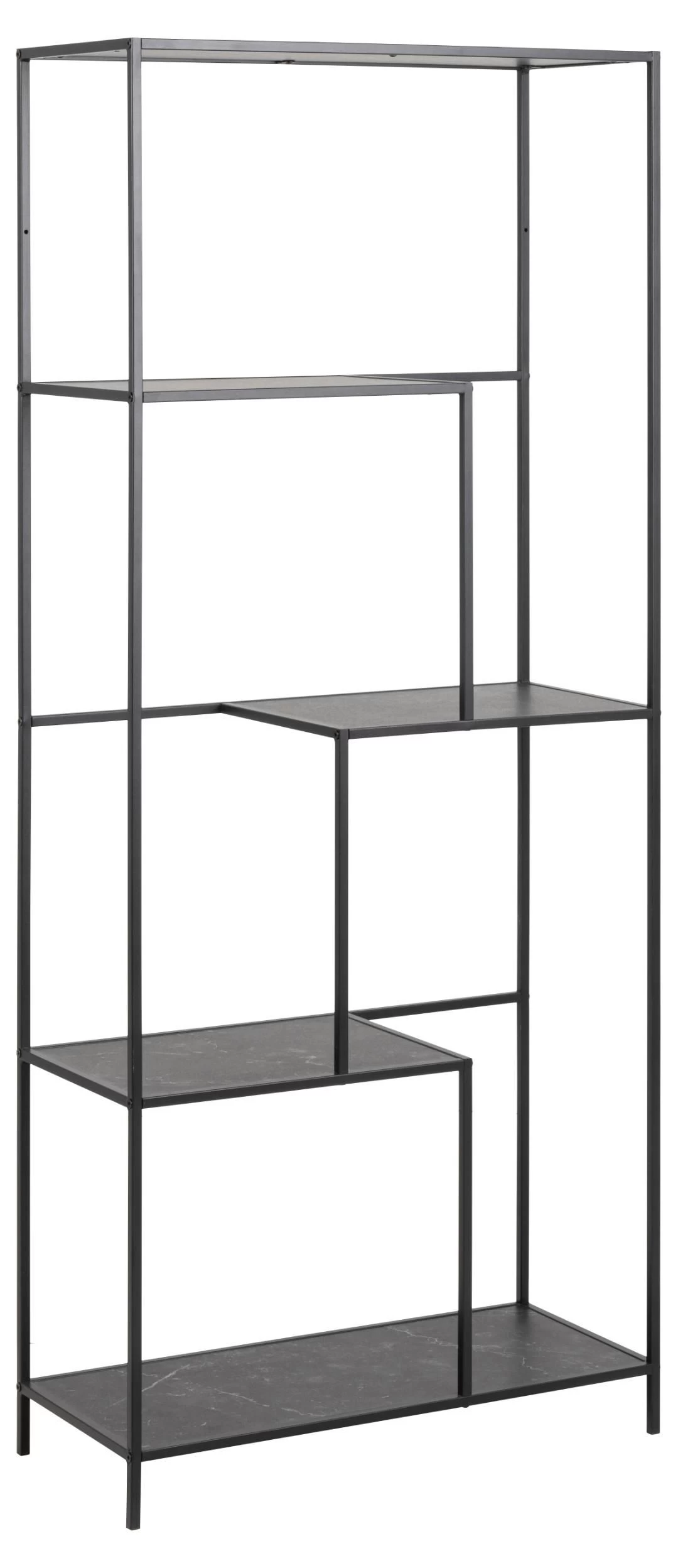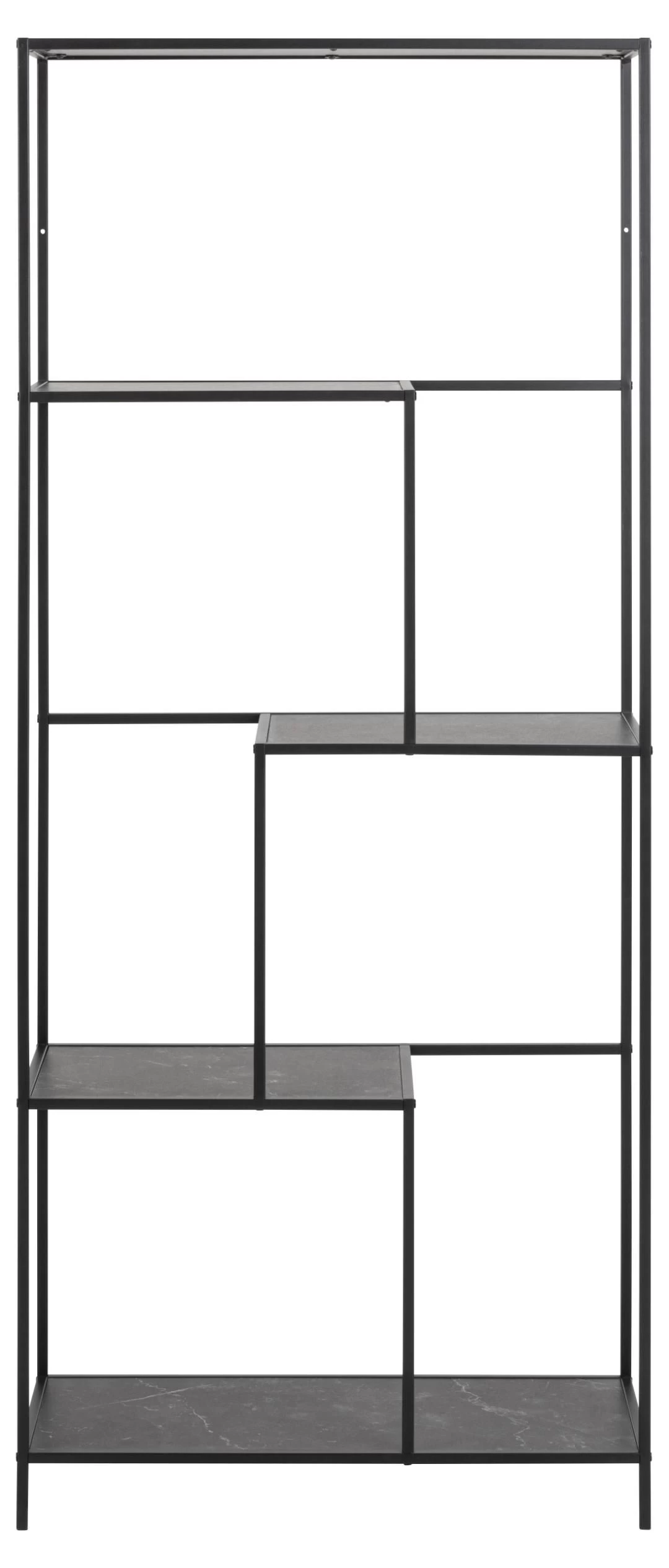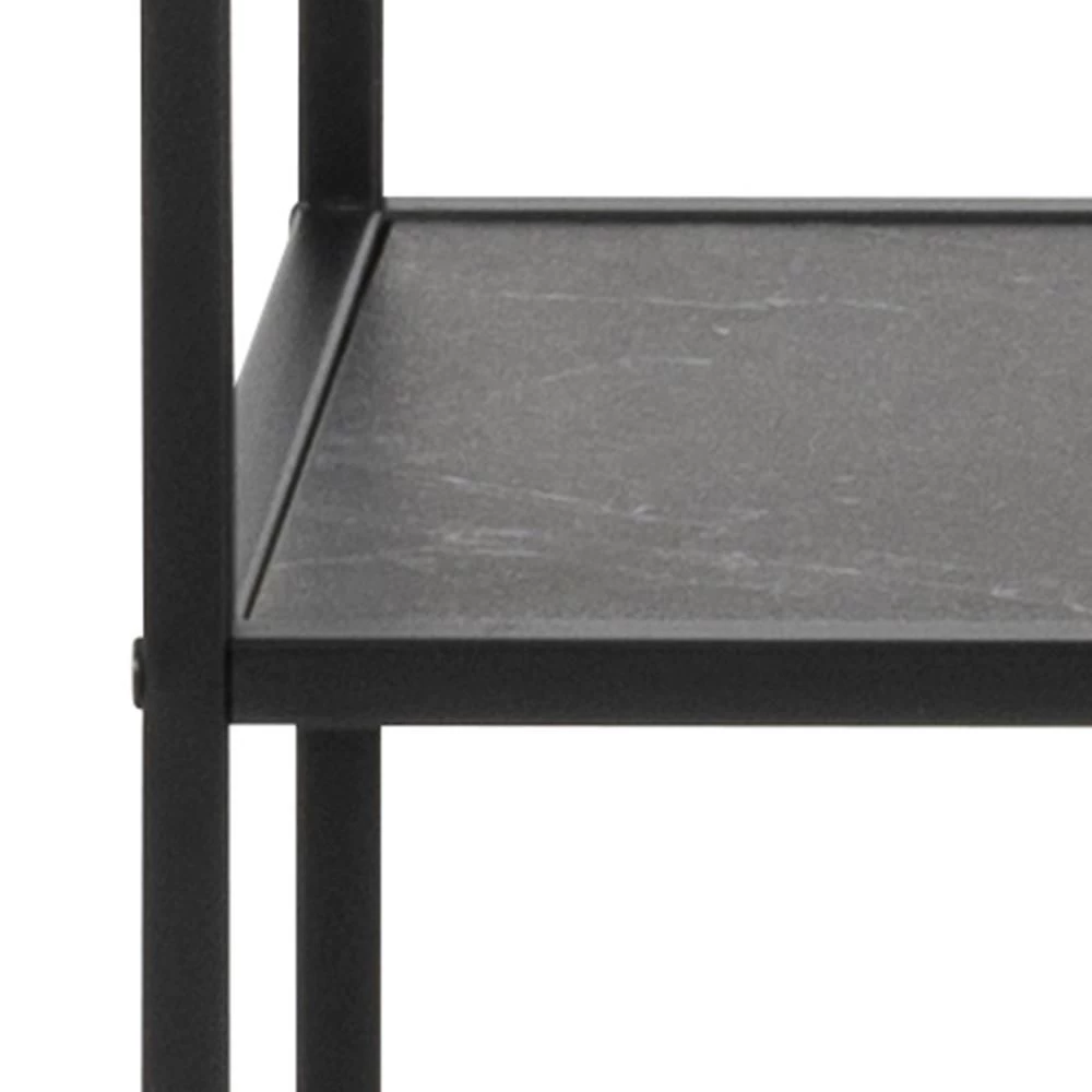 Wandrek Infinity (h: 170 cm), met 3 zwevende legplanken in marmerlook en een frame uit zwart gepoedercoat metaal.
