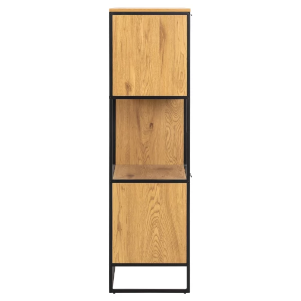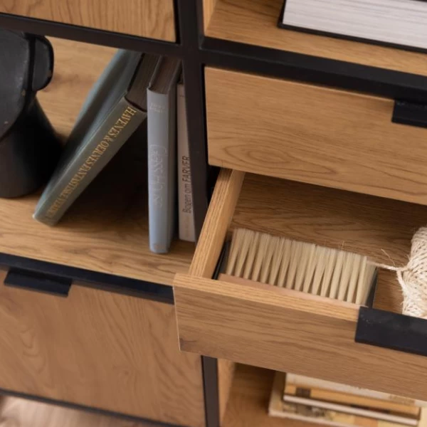 Ondanks haar asymmetrische design straalt wandrek Swindon toch rust uit. Dit is mogelijk, omdat er van tevoren goed over het design nagedacht is. Er is namelijk gekozen voor een constructie waarbij er afwisselend links en rechts opbergruimte voorzien is. De kant die niet als opbergruimte gebruikt wordt, is telkens voorzien van een legplank. In totaal heeft wandrek Swindon 2 kastjes, 3 lades en 3 legplanken, die voorzien zijn van een wilde-eikdecor. Het frame is gemaakt uit zwart gepoedercoat metaal. Dit rek heeft een hoogte van 141 cm.