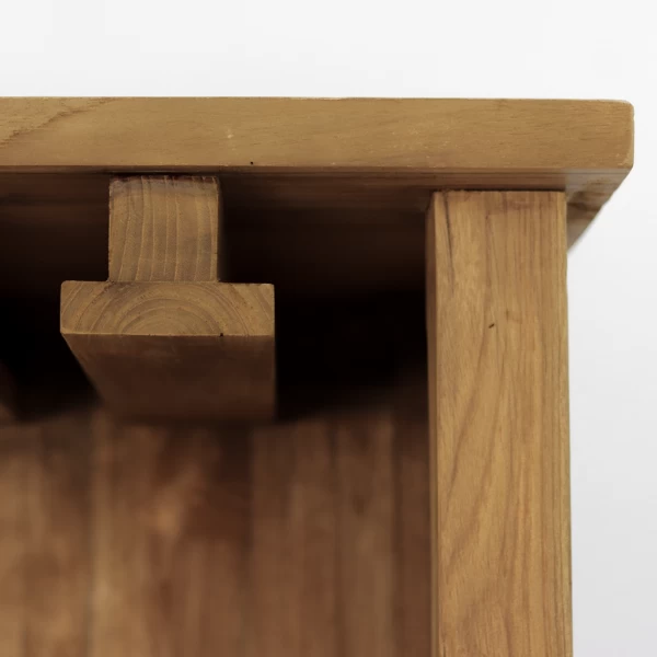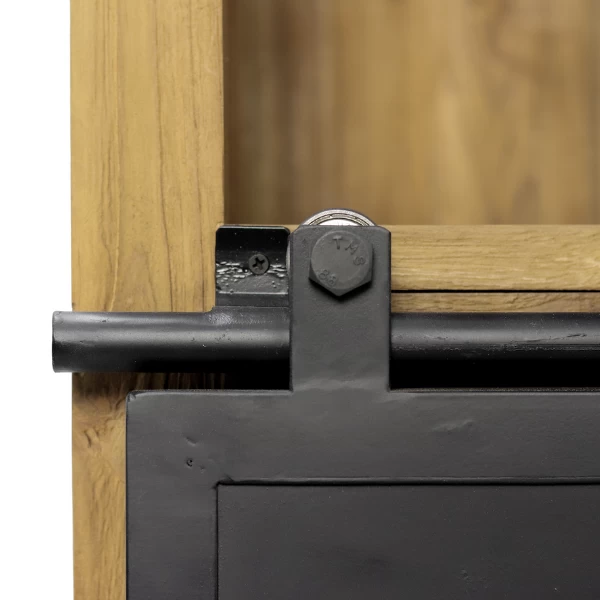 Voeg wat extra opbergruimte toe aan je huis met deze prachtige wijnkast Blackburn. De kast is handgemaakt van oud reclaimed teakhout en heeft een prachtige, rustieke afwerking. Het bovenste deel is voorzien om je wijnglazen op te bergen. Het onderste deel bevat 2 lades en 9 vakken voor wijnflessen. Achter de matzwarte schuifdeur zijn nog eens 9 wijnvakken voorzien en een legplank. Het robuuste metaal voegt een industriële tintje toe aan dit prachtige meubelstuk. De rustieke look van het doorleefde hout brengt ook met zich mee dat er mogelijks lichte scheuren of gaten op het meubel zichtbaar kunnen zijn.