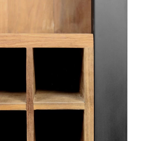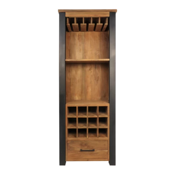 Wijnkast Zaria 75x45x190cm uit oud teakhout en metaal. Met opberglade en ruimte voor 12 flessen.